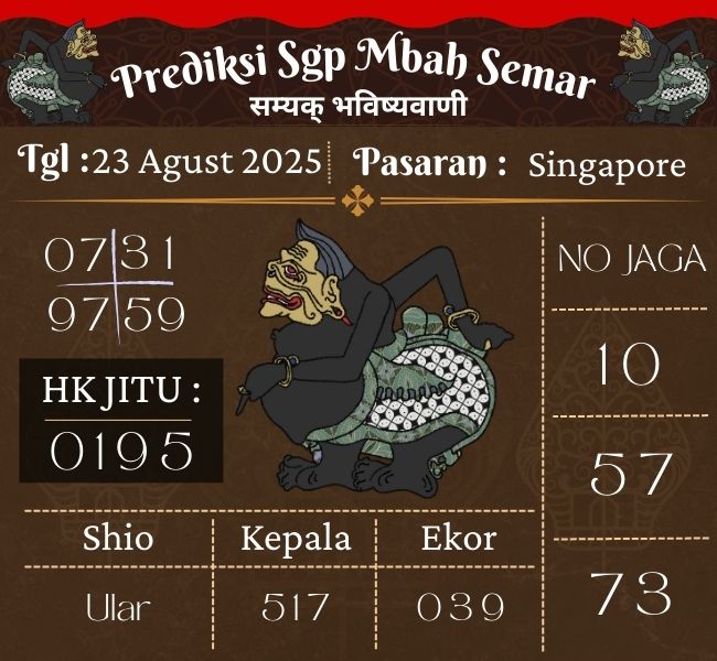 Selamat datang kepada semua pemain togel online di Prediksi SGP Mbah Semar Hari Ini, sabtu 23 agustus 2025 oleh situs Prediksisemar188. Kami menyampaikan salam penuh semangat kepada semua pemain togel yang sedang mencari angka togel jitu di situs ini. Situs prediksi togel tepercaya ini di siapkan oleh tim Prediksisemar188, bagian dari situs bandar togel yang di percaya Kaki4d.