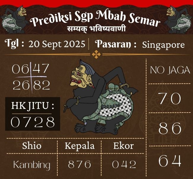 Selamat datang kepada semua pemain togel online di Prediksi SGP Mbah Semar Hari Ini, sabtu 20 september 2025 oleh situs Prediksisemar188. Kami menyampaikan salam penuh semangat kepada semua pemain togel yang sedang mencari angka togel jitu di situs ini. Situs prediksi togel tepercaya ini di siapkan oleh tim Prediksisemar188, bagian dari situs bandar togel yang di percaya Kaki4d.