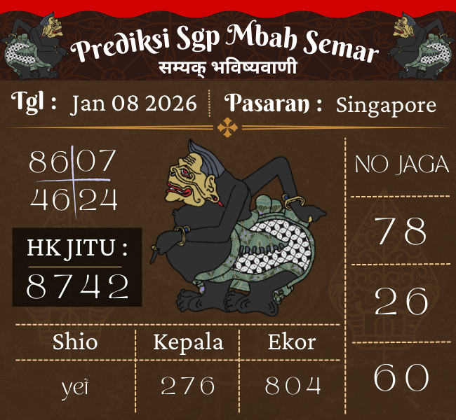 Selamat datang kepada semua pemain togel online di Prediksi SGP Mbah Semar Hari Ini, Kamis 08 Januari 2026 oleh situs Prediksisemar188. Kami menyampaikan salam penuh semangat kepada semua pemain togel yang sedang mencari angka togel jitu di situs ini. Situs prediksi togel tepercaya ini di siapkan oleh tim Prediksisemar188, bagian dari situs bandar togel yang di percaya Kaki4d.